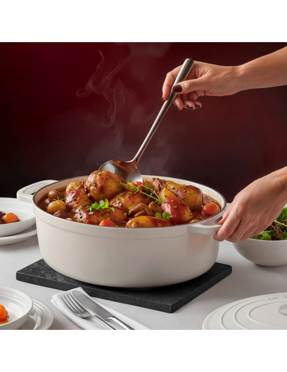 Pensée pour les moments de partage, elle est l’alliée idéale pour cuisiner en grande quantité tout en préservant la qualité des cuissons. La fonte garantit une diffusion homogène et durable de la chaleur, parfaite pour des pièces de viande entières, des volailles rôties ou de généreux plats mijotés.